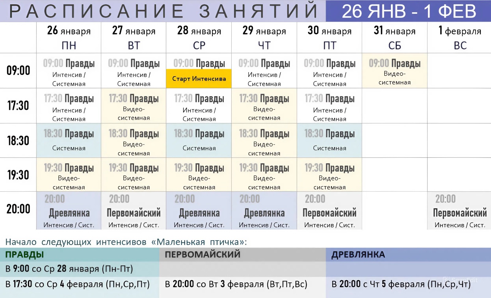 - Интенсив утро с 09:00 до 10:00 часов по Пн, Вт, Ср, Чт, Пт. Записаться на курс со среды 28 января 10 занятий с тренером - 5500 рублей (4500 рублей для тех, кто, начиная с 01.09.25 уже покупал абонемент/ы).
